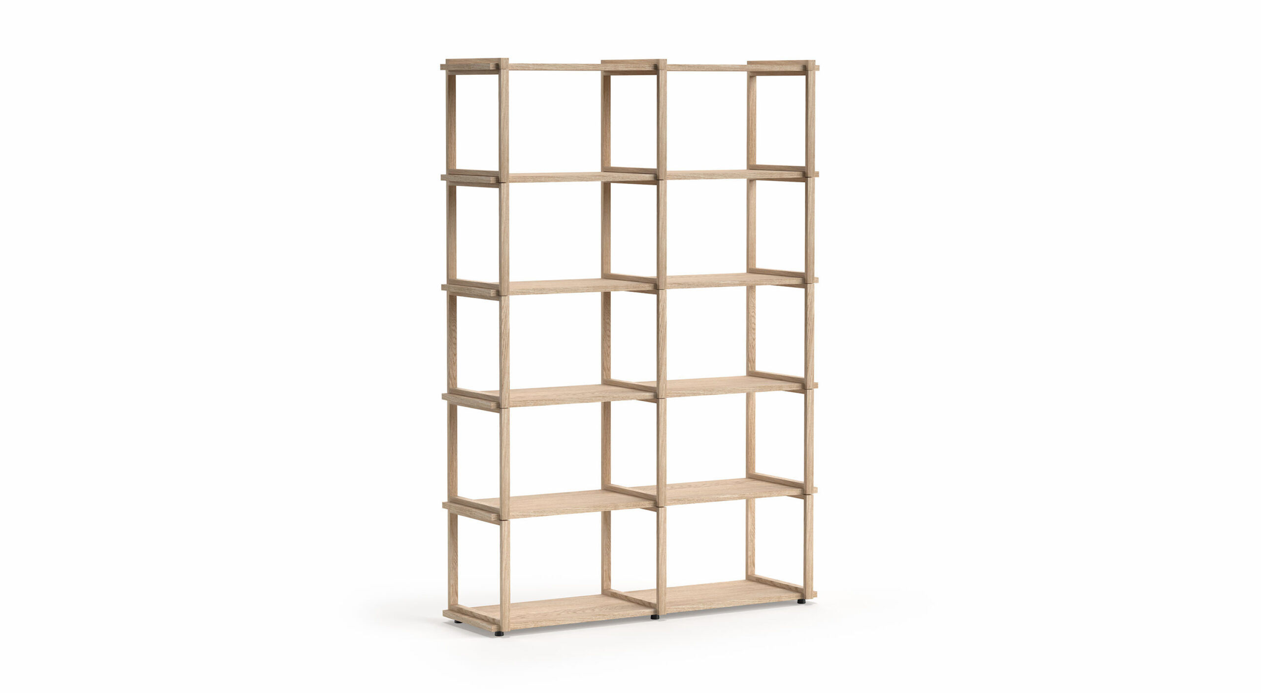 Es kann im Regalplaner individuell in Höhe und Breite konfiguriert und als Bücherregal, Raumteiler oder Büroregal genutzt werden. Zentrale Elemente sind die offenen Seitenrahmen aus Massivholz (Esche) und die Regalböden mit Echtholzfurnier (Eiche), welche die warme Ausstrahlung von Naturmaterialien ins Zuhause bringen.
