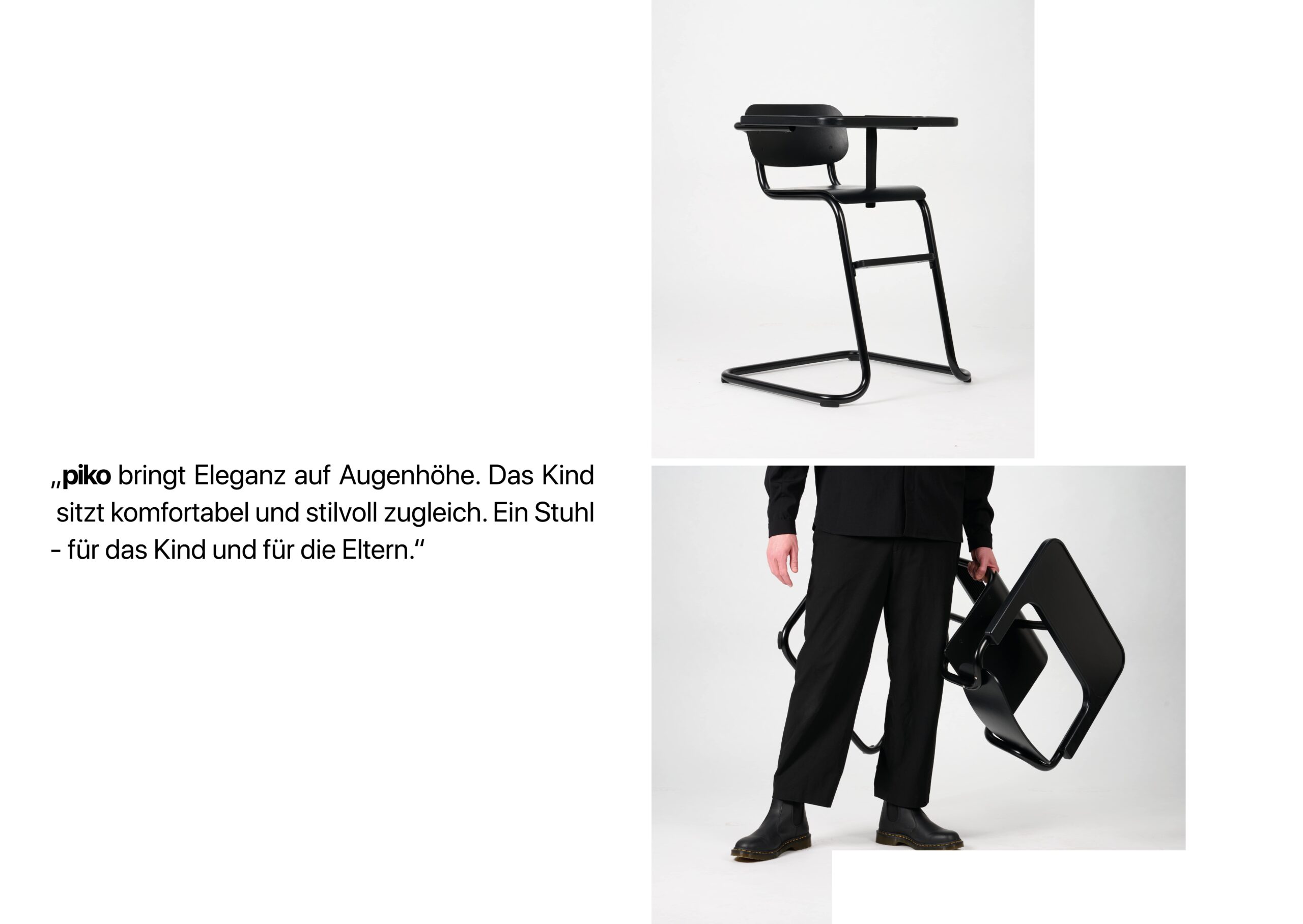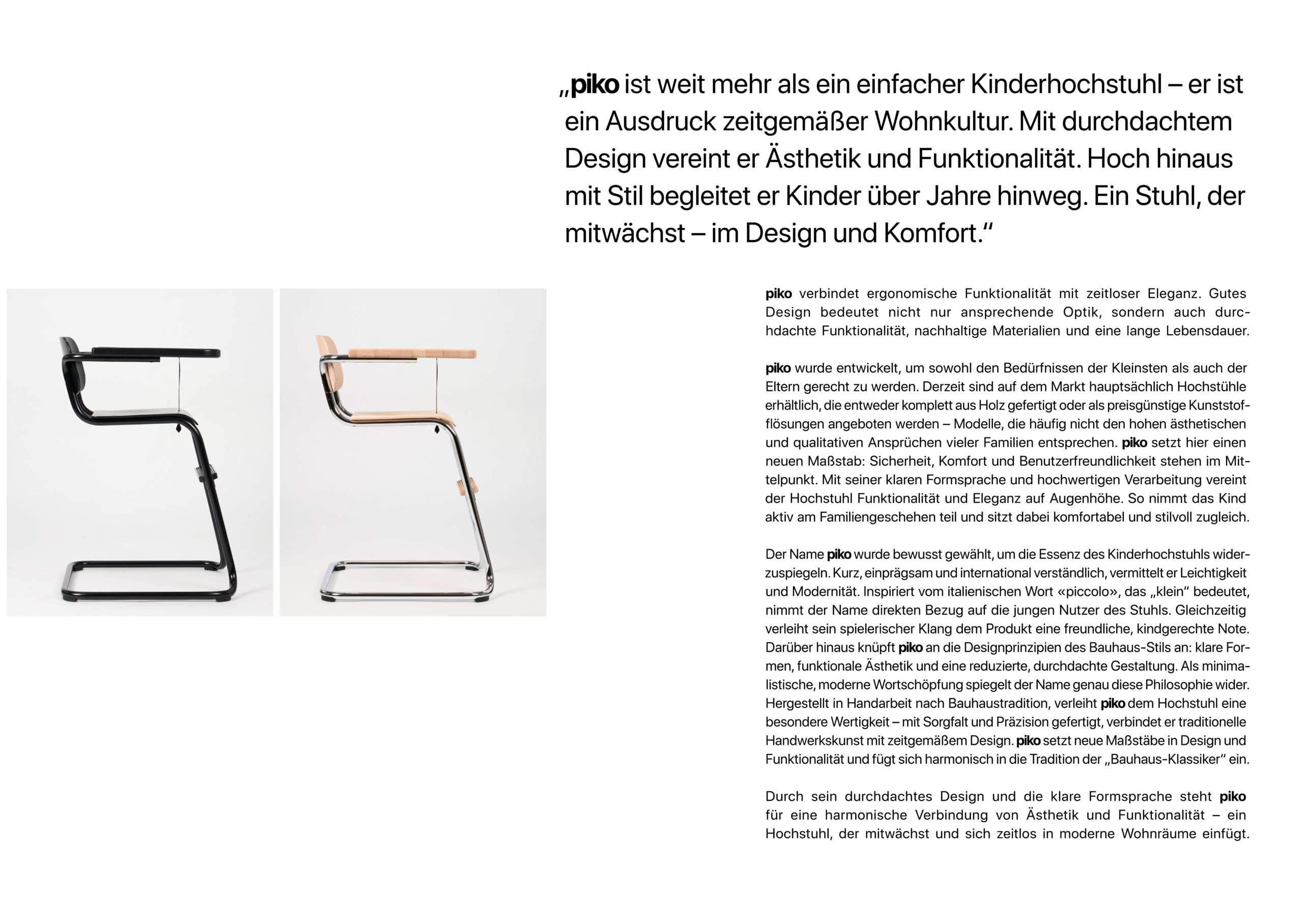 piko ist ein Ausdruck zeitgemäßer Wohnkultur. Ein Kinderhochstuhl, der mitwächst – im Design und Komfort.piko vereint ergonomische Funktionalität mit zeitloser Eleganz. Der Hochstuhl setzt neue Maßstäbe in Sicherheit, Komfort und Benutzerfreundlichkeit. Anders als herkömmliche Holz- oder Kunststoffmodelle bietet piko durchdachte Funktionalität, hochwertige Verarbeitung und ansprechendes Design. So kann das Kind stilvoll und bequem am Familiengeschehen teilnehmen.